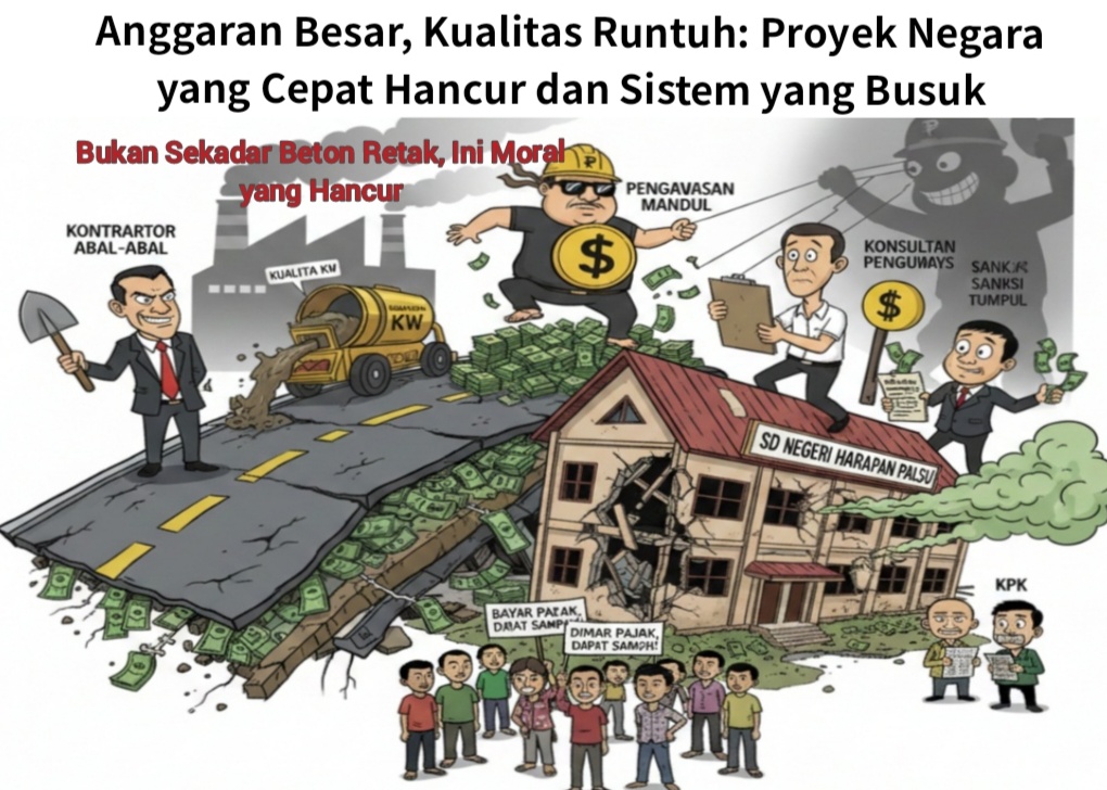Bangunan yang cepat rusak adalah simbol paling telanjang dari runtuhnya integritas tata kelola negara. Ini bukan semata kesalahan kontraktor, tetapi kejahatan kolektif yang melibatkan: