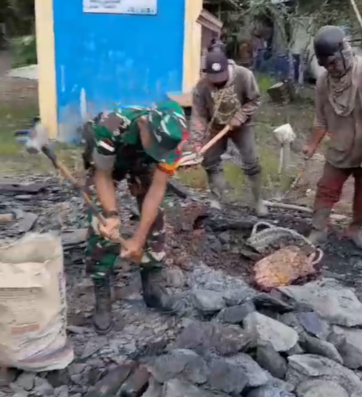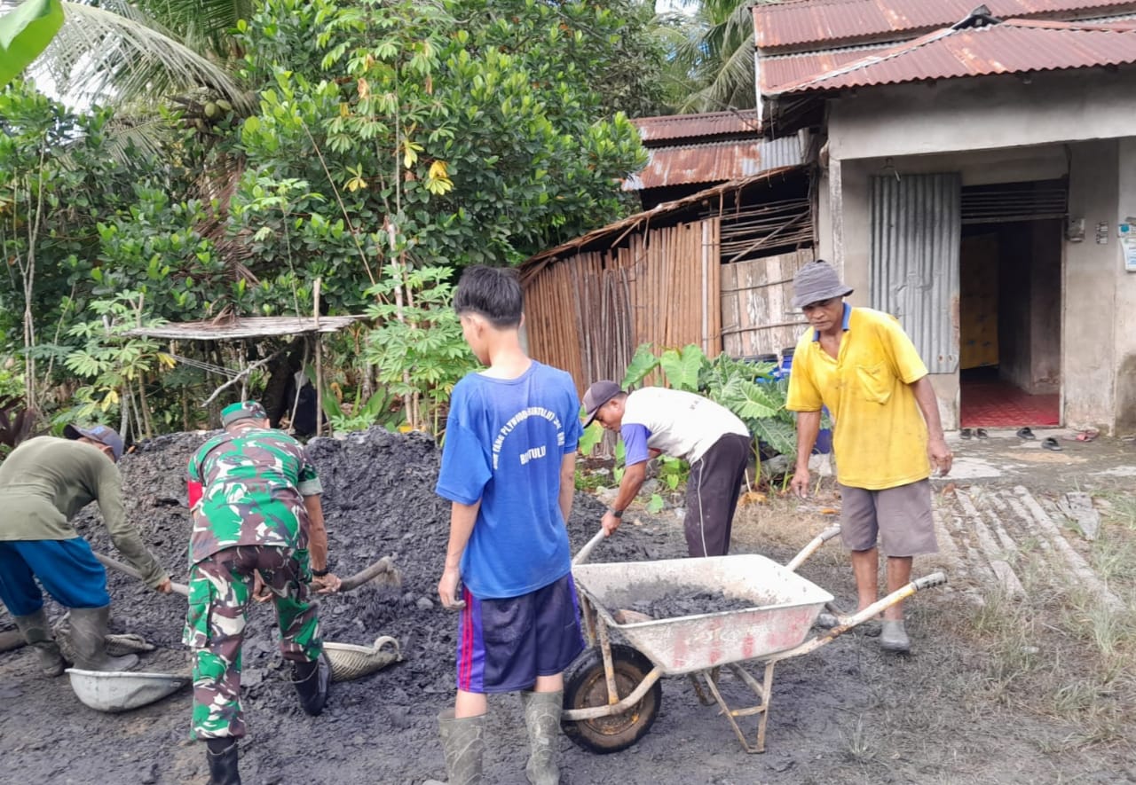 Kegiatan gotong royong ini dilaksanakan dengan melakukan penimbunan jalan rusak yang dimana jalan tersebut merupakan salah satu akses masyarakat untuk beraktivitas terutama aktivitas perekonomian, ungkap Serda Suryadi.