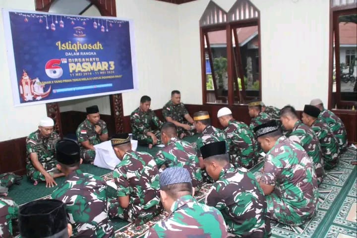 Doa bersama yang dipimpin oleh Dantonban Kima Yonmarhanlan X Letda Marinir Maarif Saefudin merupakan kegiatan yang dilaksanakan dalam rangka menyambut Hari Ulang Tahun (HUT) Ke-6 Pasmar 3. Sebagai umat beragama, pada hari ini prajurit Yonmarhanlan X bersimpuh dihadapan Allah SWT seraya berdoa untuk memohon petunjuk dan perlindunganNya.
