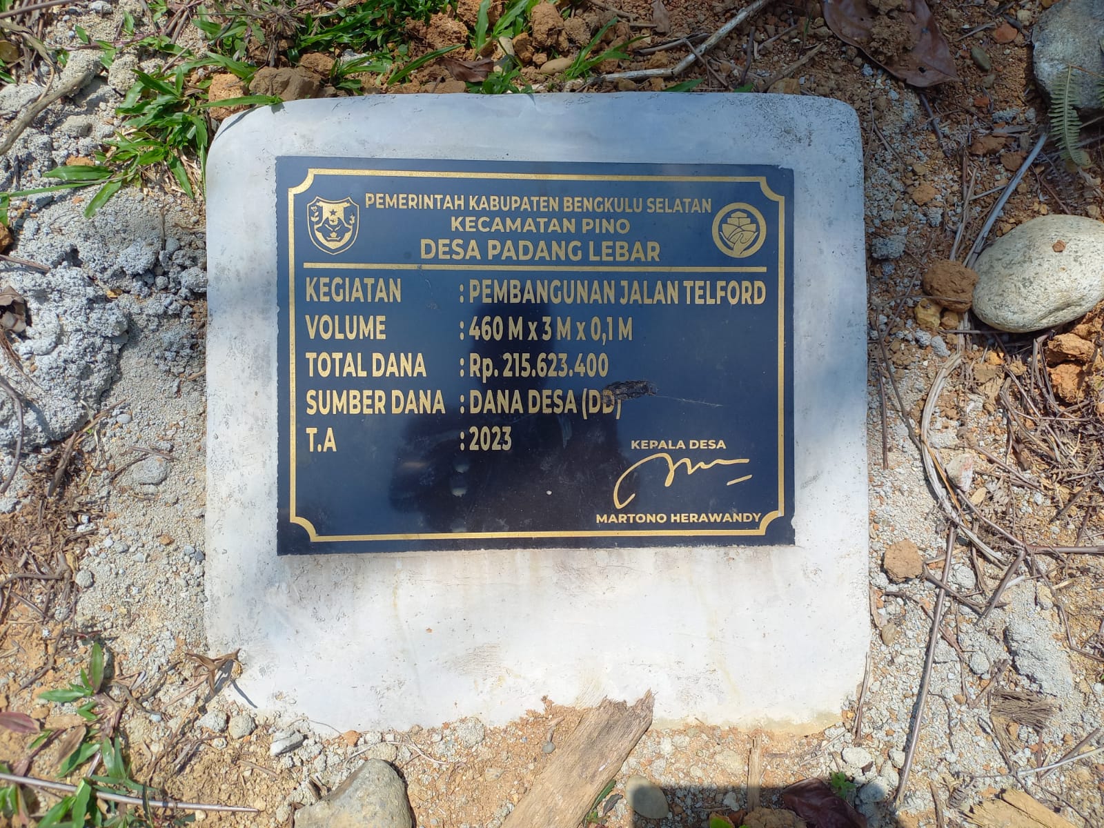 Bengkulu Selatan Penasilet.com,-  Dengan menggunakan dana DD seperti Pengerjaan jalan Disalah satu desa, yang mana jalan tersebut terleta di wilayah Area perkebunan warga desa padang lebar kecamatan pino kabupaten Bengkulu Selatan, Pengerjaan jalan menelan anggaran dana desa tahun 2023, mencapai dua Ratus lima belas juta Rupiah.