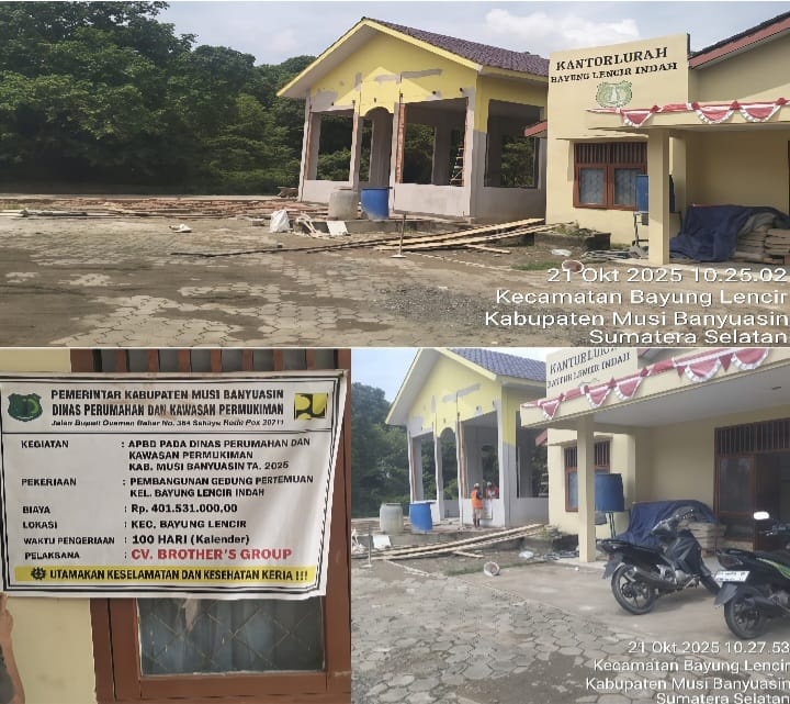 MUSI BANYUASIN,Penasilet.com – Proyek pembangunan Gedung Pertemuan Kelurahan Bayung Lencir Indah, Kecamatan Bayung Lencir, Kabupaten Musi Banyuasin (Muba), yang dibiayai dari APBD Muba Tahun Anggaran 2025 senilai Rp 401.531.000,00, kini menjadi sorotan tajam publik dan media.