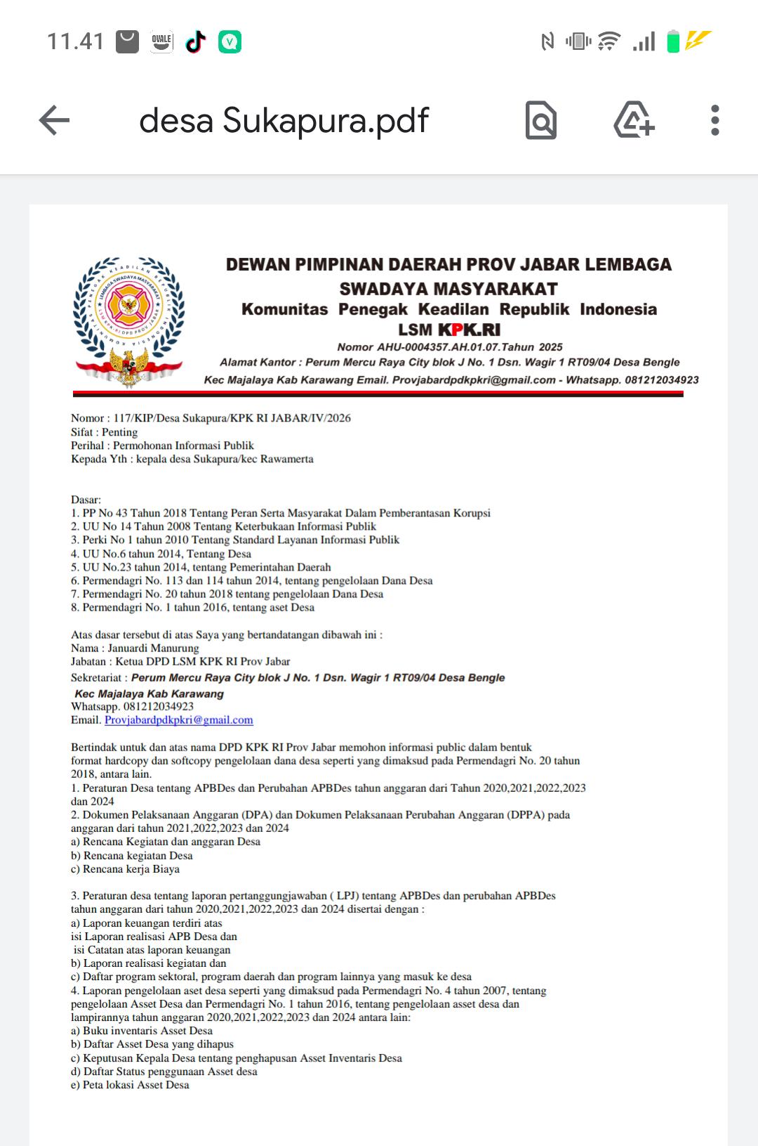 KARAWANG, penasilet.com Ketua Dewan Pimpinan Daerah (DPD) Lembaga Swadaya Masyarakat Komunitas Penegak Keadilan Republik Indonesia (LSM KPK.RI) Provinsi Jawa Barat, Januardi Manurung, resmi mengirimkan surat permohonan informasi publik kepada Kepala Desa Sukapura, Kecamatan Rawamerta. Surat bernomor 117/KIP/Desa Sukapura/KPK RI JABAR/IV/2026 ini bersifat penting dan dikirim sebagai bentuk pengawasan sosial atas pengelolaan keuangan dan aset desa yang harus dijalankan secara terbuka dan akuntabel.