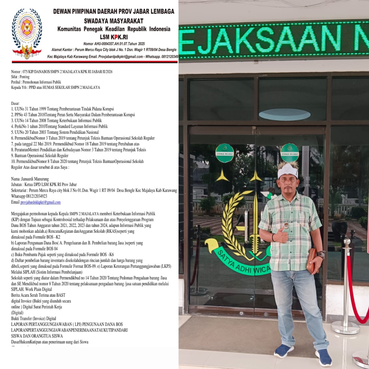 Surat bernomor 075/KIP-DANABOS/SMPN 2 MAJALAYA/KPK RI JABAR/II/2026 tertanggal 5 Februari 2026 itu ditandatangani Ketua DPD LSM KPK RI Jabar, Januardi Manurung.