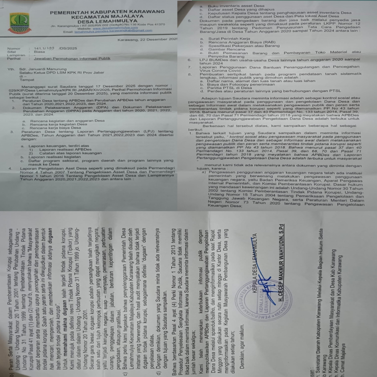 Dalam pernyataannya, Januardi Manurung mengungkapkan bahwa total Dana Desa yang dikelola Pemerintah Desa Lemahmulya sepanjang 2020 hingga 2025 mencapai angka fantastis, yakni Rp 6.928.279.000. Namun alih-alih disertai transparansi, publik justru dihadapkan pada sikap tertutup pemerintah desa, yang menolak membuka data fisik maupun administrasi melalui surat resmi bernomor 141.1/86/DS/2025.