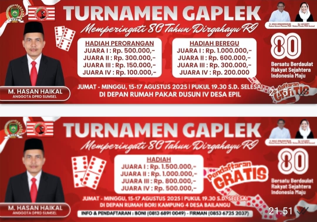 MUSI BANYUASIN,Penasilet.com – Dalam rangka memperingati Hari Ulang Tahun (HUT) Kemerdekaan Republik Indonesia ke-80, Anggota Dewan Perwakilan Rakyat Daerah (DPRD) Provinsi Sumatera Selatan dari Partai Kebangkitan Nasional (PKN), M. Hasan Haikal, akan mengadakan turnamen gaplek di dua desa berbeda Kecamatan di Kabupaten Musi Banyuasin (MUBA). Acara ini akan berlangsung dari tanggal 15 hingga 17 Agustus 2025.