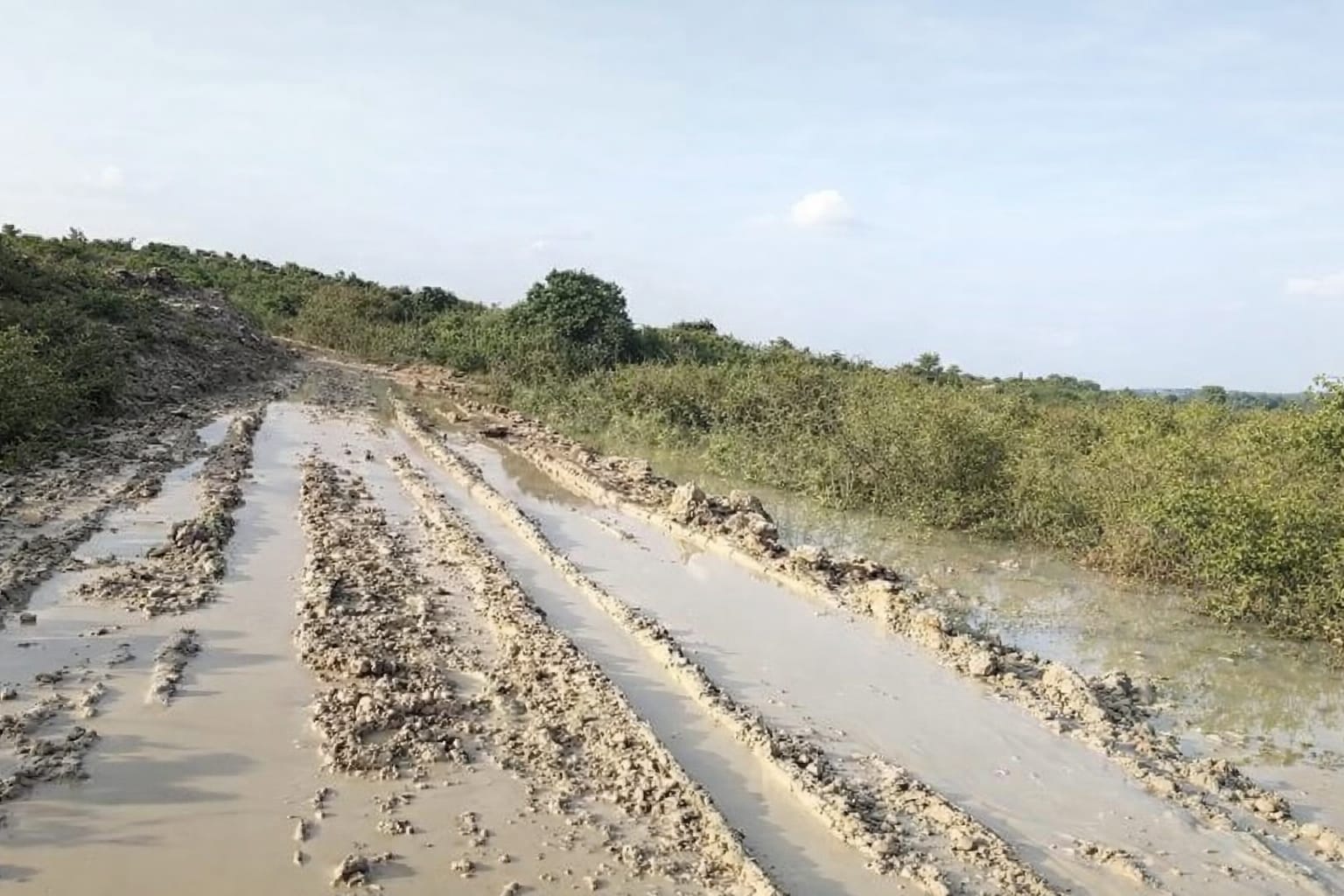 Dalam video amatir yang beredar, kondisi jalan tersebut tampak lebih menyerupai parit berlumpur ketimbang infrastruktur publik.