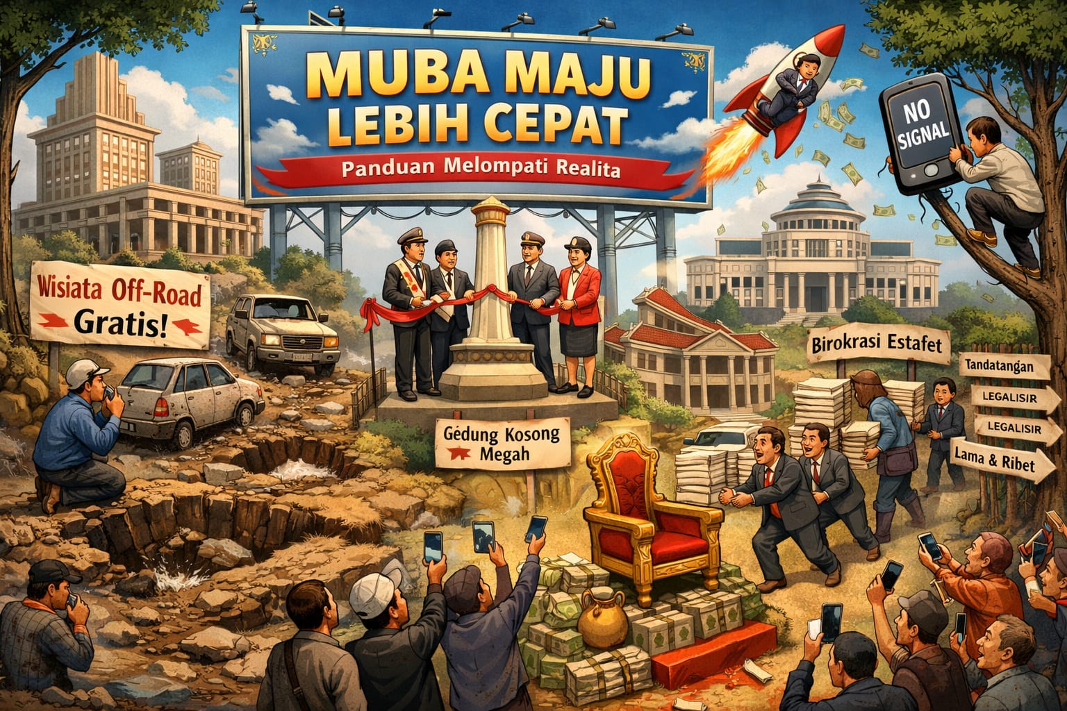JAKARTA,Penasilet.com – Selamat dan tepuk tangan meriah patut diberikan kepada Pemerintah Kabupaten Musi Banyuasin atas kelahiran tagline barunya: “Muba Maju Lebih Cepat.” Sebuah frasa pendek, ringan diucap, berat di imajinasi. Tagline ini bukan sekadar slogan, ia adalah harapan, doa, sekaligus tantangan logika.