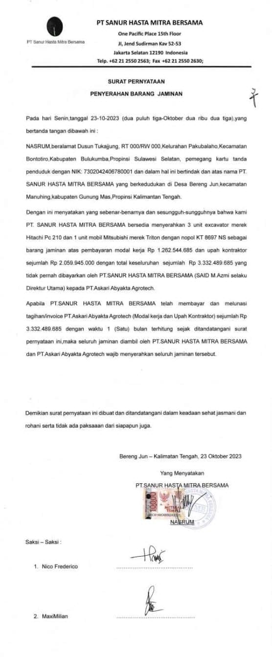 Surat panggilan pemeriksaan yang di berikan kepada saya melalui pesan WhatsApp tersebut sangat janggal ,isinya poin terakhir berbunyi apa bila saya dkk tidak memenuhi panggilan oknum tersebut sampai 3X maka saya dkk akan di jemput paksa ,saya heran saya ini korban, kok saya yang di laporkan perampasan alat berat,sedangkan PT Sanur hasta mitra bersama memilik hutang kepada saya dkk senilai miliaran rupiah, ada dugaan kaut bahwa kemungkinan besar oknum ” penerima laporan tersebut telah bekerja sama buat intimidasi saya dkk agar kami di penjara dan uang kami hilang begitu saja,” tegasnya.