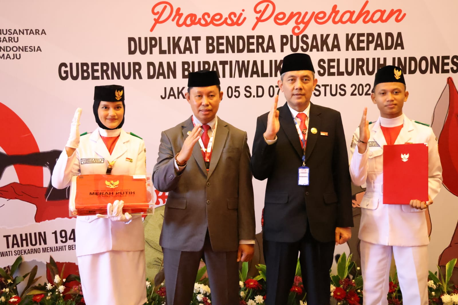 Penasilet.com- JAKARTA| Pj. Bupati Bogor, Asmawa Tosepu menerima duplikat bendera pusaka dari Badan Pembinaan Ideologi Pancasila (BPIP), dalam rangka menyambut hari ulang tahun (HUT) Kemerdekaan RI ke-79, di Balai Samudera, Jakarta, Senin (6/8).