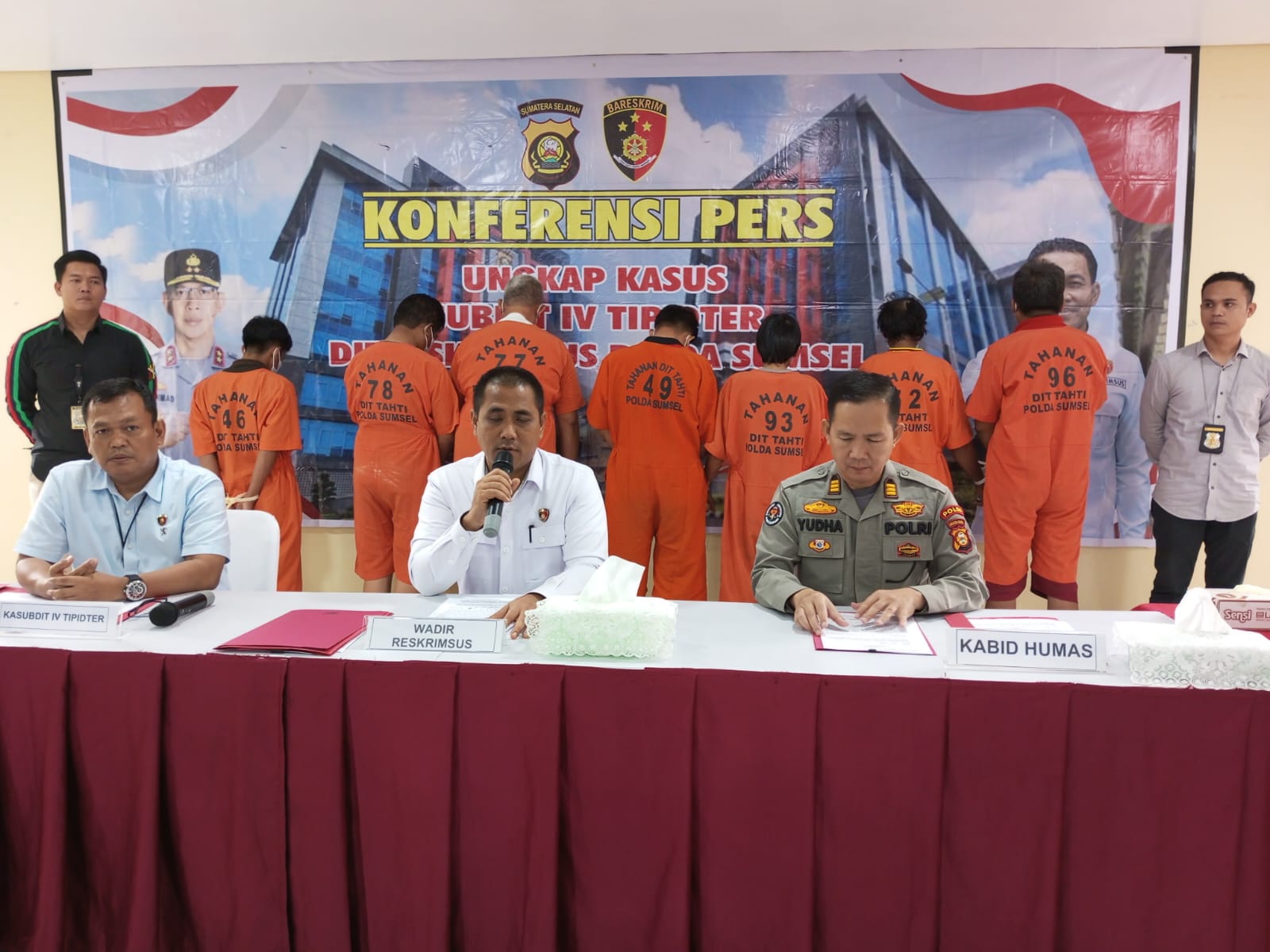 Wadir Reskrimsus AKBP. Putu Yudha Prawira didampingi Kabid Humas diwakili Paur Mitra Subbid Penmas Humas Polda Sumsel AKP. Rama Yudha, dan Kasubdit IV Tipidter Polda Sumsel menggelar konferensi pers Ungkap kasus tindak pidana Penyalagunaan BBM jenis Solar Bersubsidi di Kecamatan Buay Sandang Aji Kabupaten OKU Selatan yang di gelar di ruang press conference Polda Sumsel, Kamis (24/08/2023).