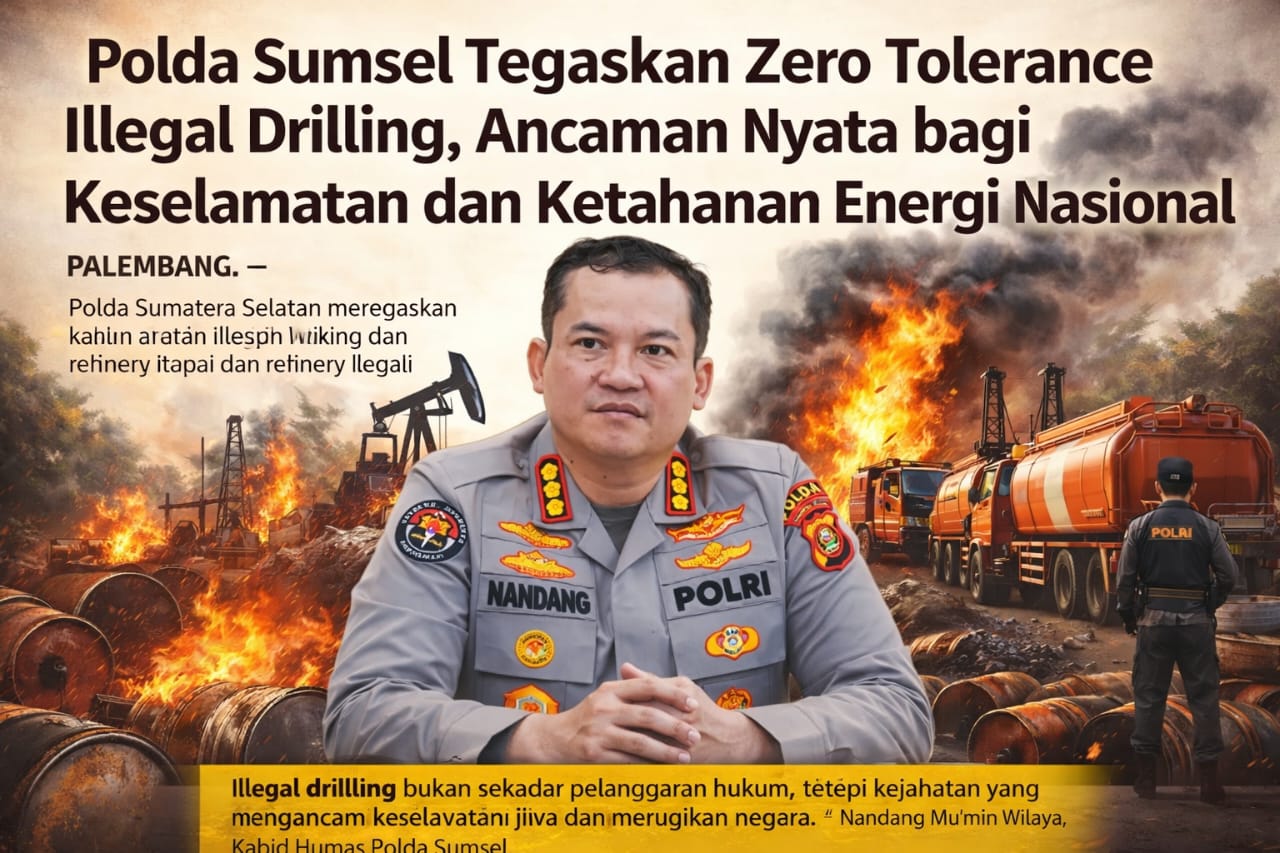 PALEMBANG,Penasilet.com – Polda Sumatera Selatan menegaskan bahwa praktik illegal drilling dan refinery ilegal tidak lagi dapat dipandang sebagai persoalan hukum daerah semata. Aktivitas tersebut dinilai telah berkembang menjadi ancaman serius terhadap keselamatan masyarakat, kelestarian lingkungan, hingga ketahanan energi nasional.