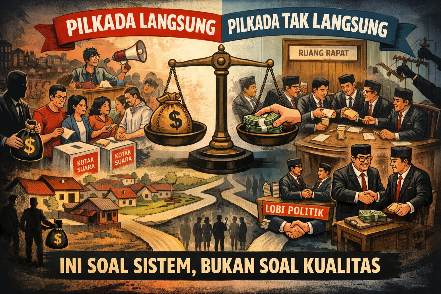 Pilkada tak langsung dijual sebagai obat mujarab. Padahal itu hanya memindahkan apoteknya. Uang tetap beredar, hanya jalurnya dipersempit. Dari banyak tangan ke segelintir tangan. Dari kampung ke ruang rapat. Dari pengawasan publik ke kesepakatan privat.