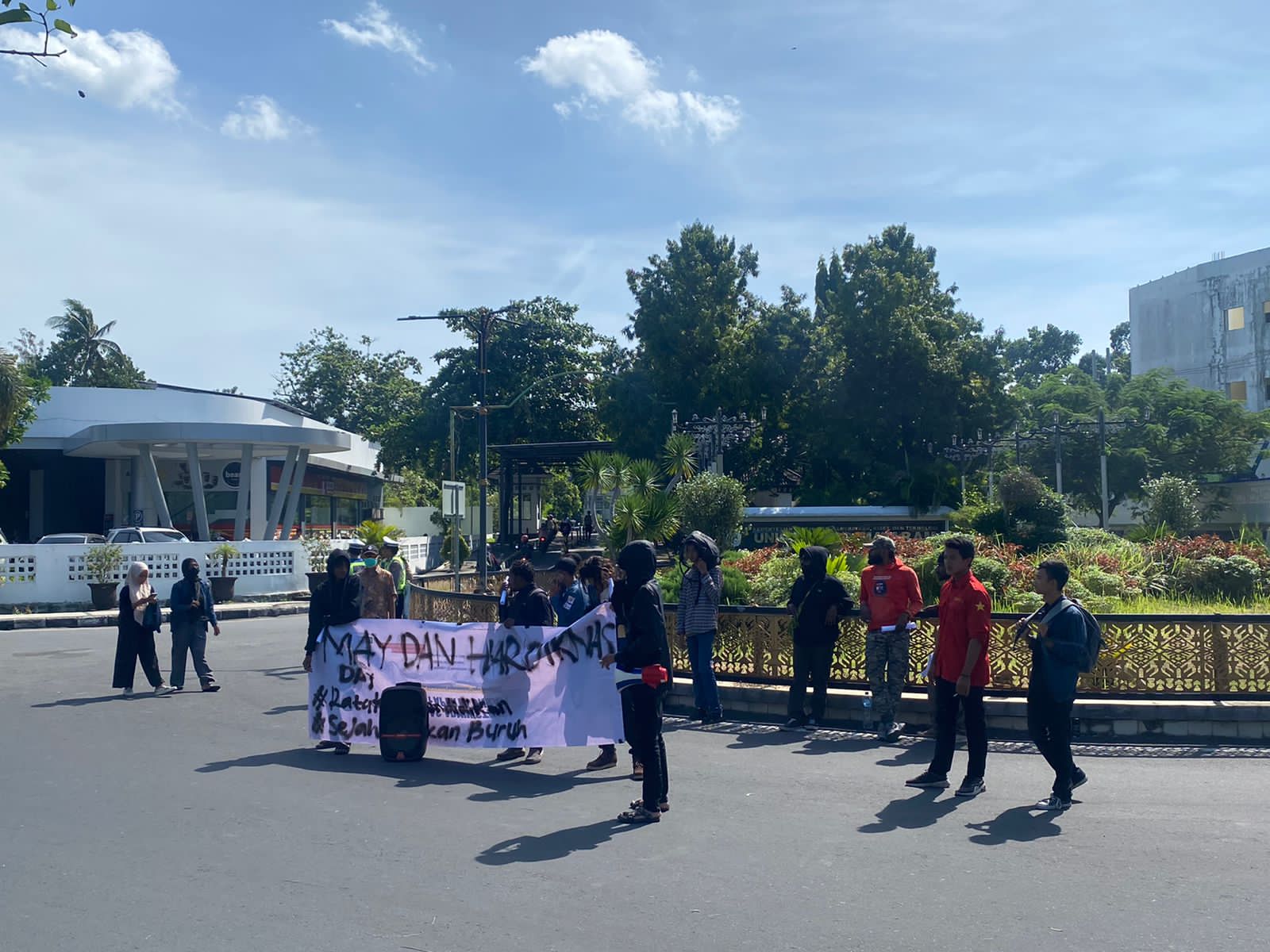 Aksi mimbar bebas dari BEM (Badan Eksekutif Mahasiswa) Unram terkait dengan momentum Hari Buruh Nasional dan Hari Pendidikan Nasional Tahun 2024, dengan jumlah masa 15 orang, sebagai Korlap Ketua BEM Unram Sdr. Herianto.