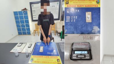 Adapun barang bukti yang diamankan adalah 1 buah jaket warna abu hitam yang pada sakunya terdapat 1 buah klip bening di dalamnya terdapat 1 buah klip bening yang berisikan kristal bening diduga Narkotika jenis Shabu, 2 poket kristal bening diduga Narkotika jenis Shabu siap edar, 1 buah pipa kaca yang di dalamnya terdapat padatan diduga Narkotika jenis shabu, 1 buah pipet plastik. Adapun jumlah berat brutto BB diduga Shabu 3,83 gram, 2 buah HP dan uang tunai Rp. 490.000,-.