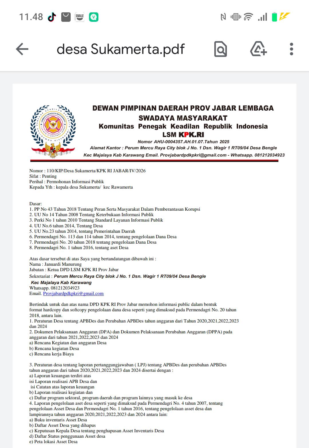 Transparansi Keuangan Dipertanyakan, Ketua DPD LSM KPK.RI Jabar Kirim Surat Permohonan Informasi ke Desa Sukamerta