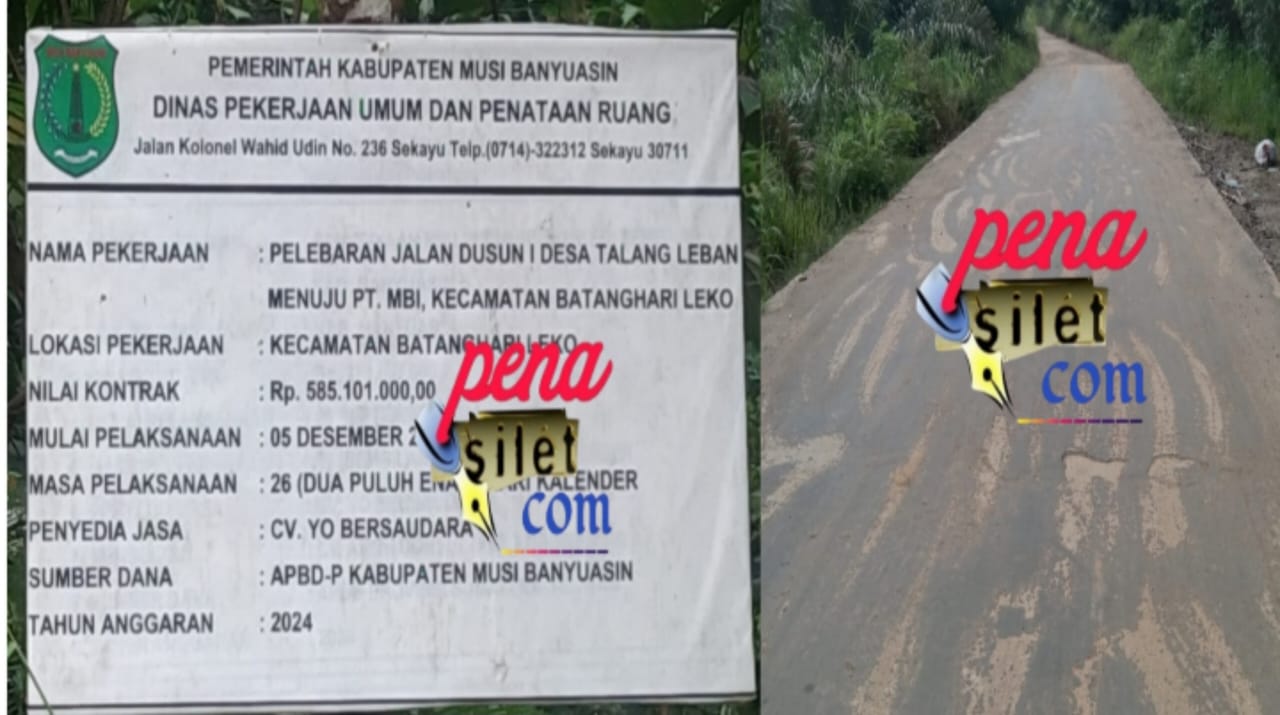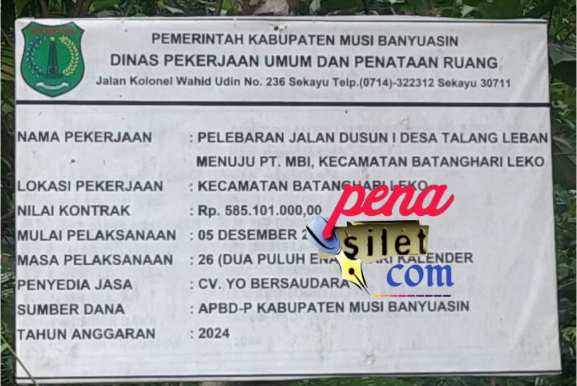 MUSI BANYUASIN,Penasilet.com – Proyek pelebaran jalan di Dusun I Desa Talang Leban menuju PT. MBI, Kecamatan Batanghari Leko, Kabupaten Musi Banyuasin (MUBA), Provinsi Sumatera Selatan (SUMSEL) menelan anggaran Rp. 585.101.000,00, kini menjadi sorotan tajam. Proyek yang didanai dari Anggaran Pendapatan dan Belanja Daerah (APBD) Perubahan Tahun 2024 ini, dengan masa pelaksanaan hanya 26 hari yang dimulai pada 5 Desember 2024, diduga bermasalah dan berpotensi adanya penyimpangan dalam pelaksanaan.